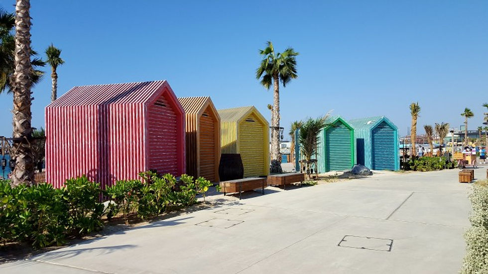La Mer Dubai is a beachfront development spread along almost 2.5 km of white sandy beach, designed in a relaxing style utilizing plenty of wooden elements, accented with quirky lights, and is connected with wooden boardwalks. Apart from the striking sea side scenery, little ponds and water fountains are scattered along the promenade, complete with towering palm trees. The strip is dotted with colourful cottages which serve as showers for those who enjoy a refreshing dip in the sea, and the occasional pop up food stalls selling yummy things like fresh coconuts, icy juices, corn on the cob, and authentic gelato!